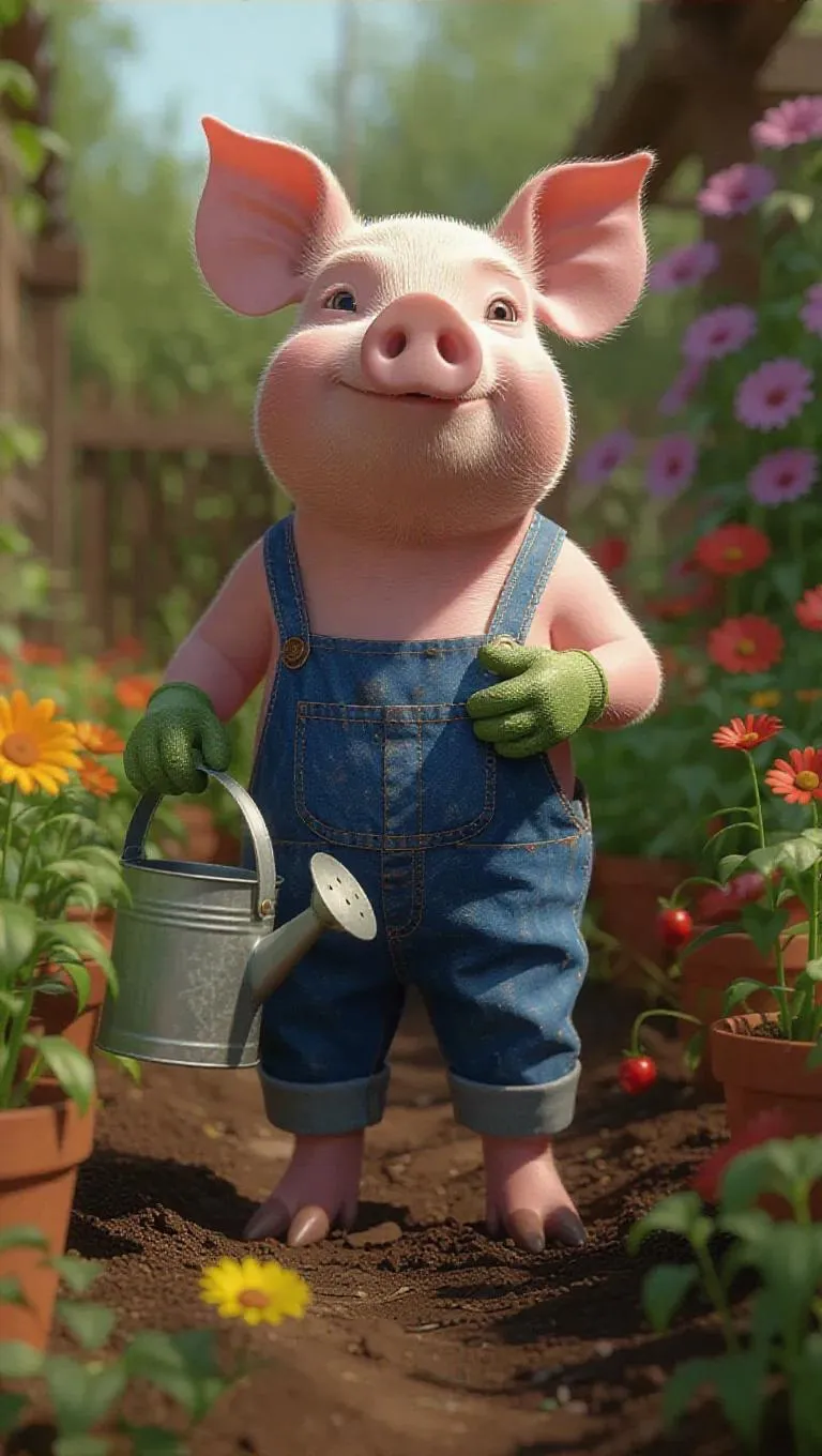 A 3D pig image wearing a gardener's overalls and gloves, standing upright on two legs like a human, holding a watering can and tending to plants, surrounded by a lush garden with flowers and vegetables, exuding a nurturing