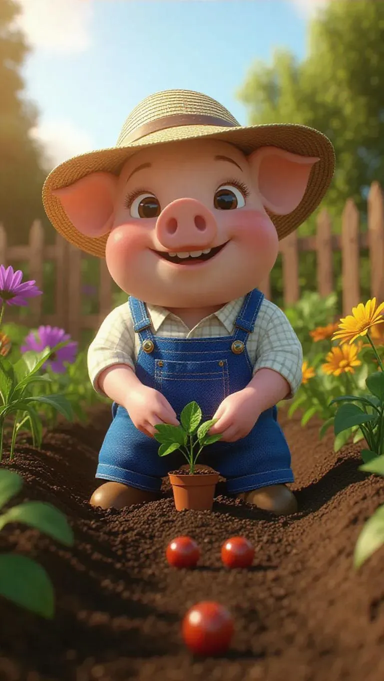 A 3D pig image wearing a gardener's overalls and sunhat, kneeling on the ground, planting seeds in the soil, surrounded by a vibrant garden with flowers and vegetables, exuding a cheerful