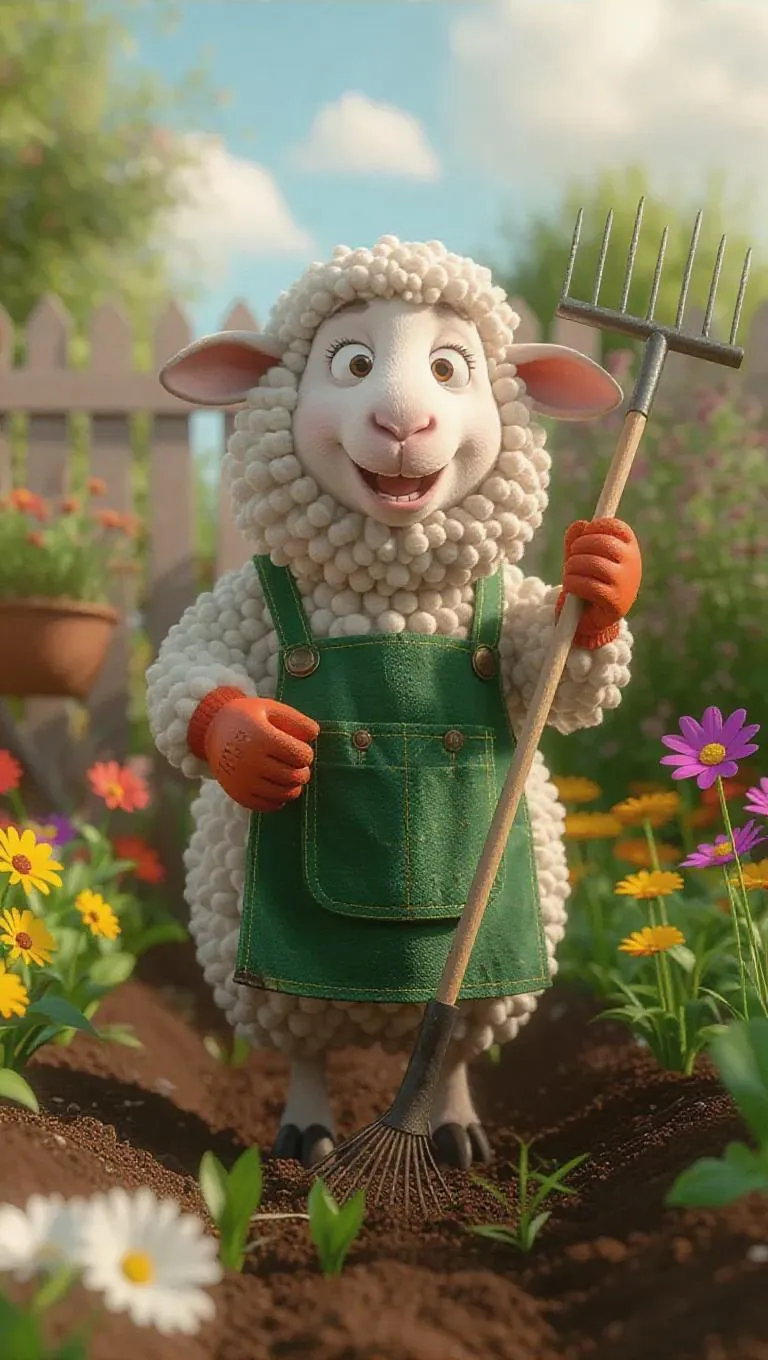 A 3D sheep image wearing a gardener's apron and gloves, standing upright on two legs like a human, holding a rake and clearing weeds, surrounded by a flourishing garden with flowers and vegetables, exuding a joyful