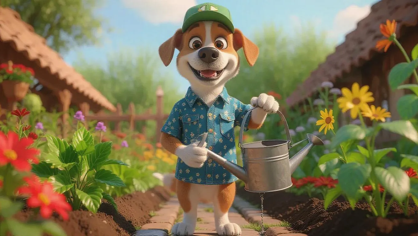 A 3D dog image wearing a gardener's shirt and cap, standing upright on two legs, holding a watering can and smiling, surrounded by a thriving garden with flowers and vegetables, exuding a happy