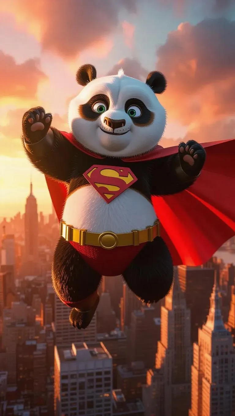 A 3D panda image wearing a superhero costume, standing upright on two legs like a human, holding a cape and posing heroically, surrounded by a city skyline with tall buildings and a sunset, exuding a dynamic and adventurous atmosphere.