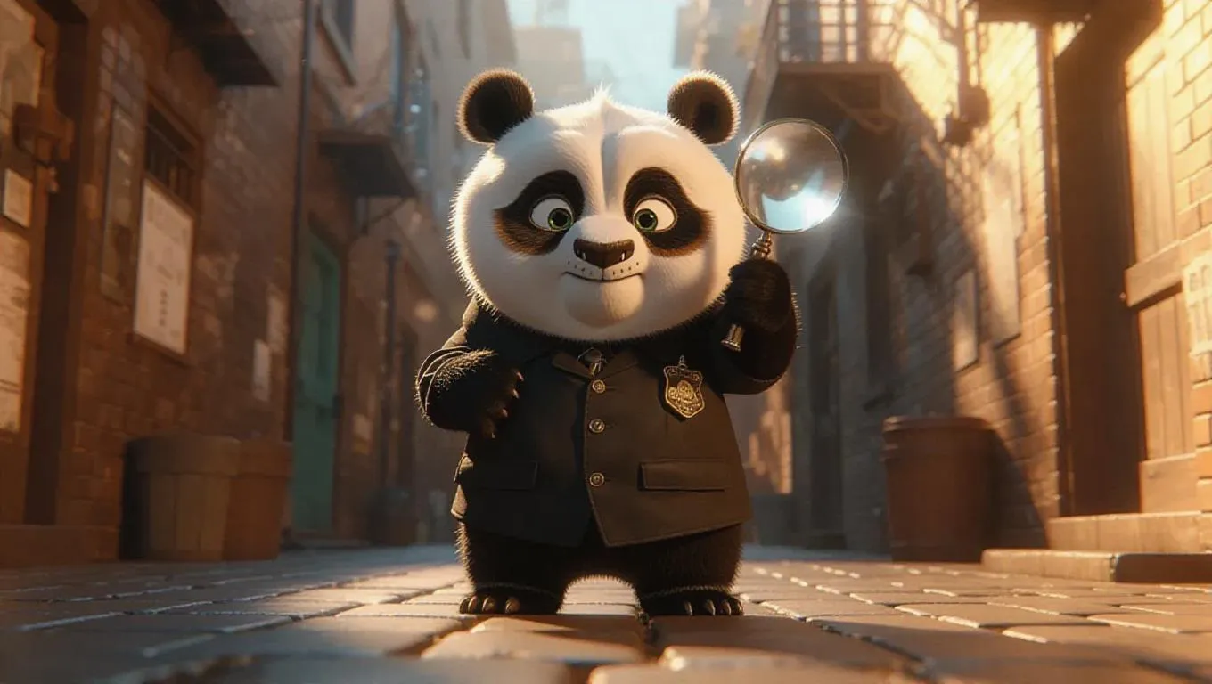 A 3D panda image wearing a detective's outfit, standing upright on two legs like a human, holding a magnifying glass and investigating, surrounded by a mysterious alley with clues and shadows, exuding a suspenseful and intriguing atmosphere.