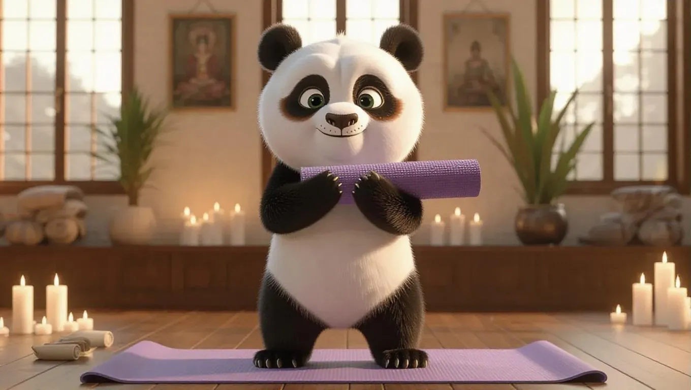 A 3D panda image wearing a yoga instructor's outfit, standing upright on two legs like a human, holding a yoga mat and demonstrating a pose, surrounded by a serene studio with candles and calming decorations, exuding a peaceful and meditative atmosphere.