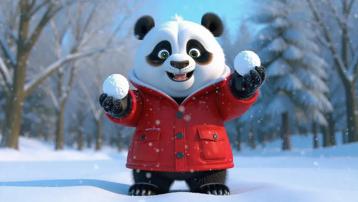 A 3D panda image wearing a winter coat, standing upright on two legs like a human, holding a snowball and playing in the snow, surrounded by a snowy park with trees and snowflakes, exuding a joyful and festive atmosphere.