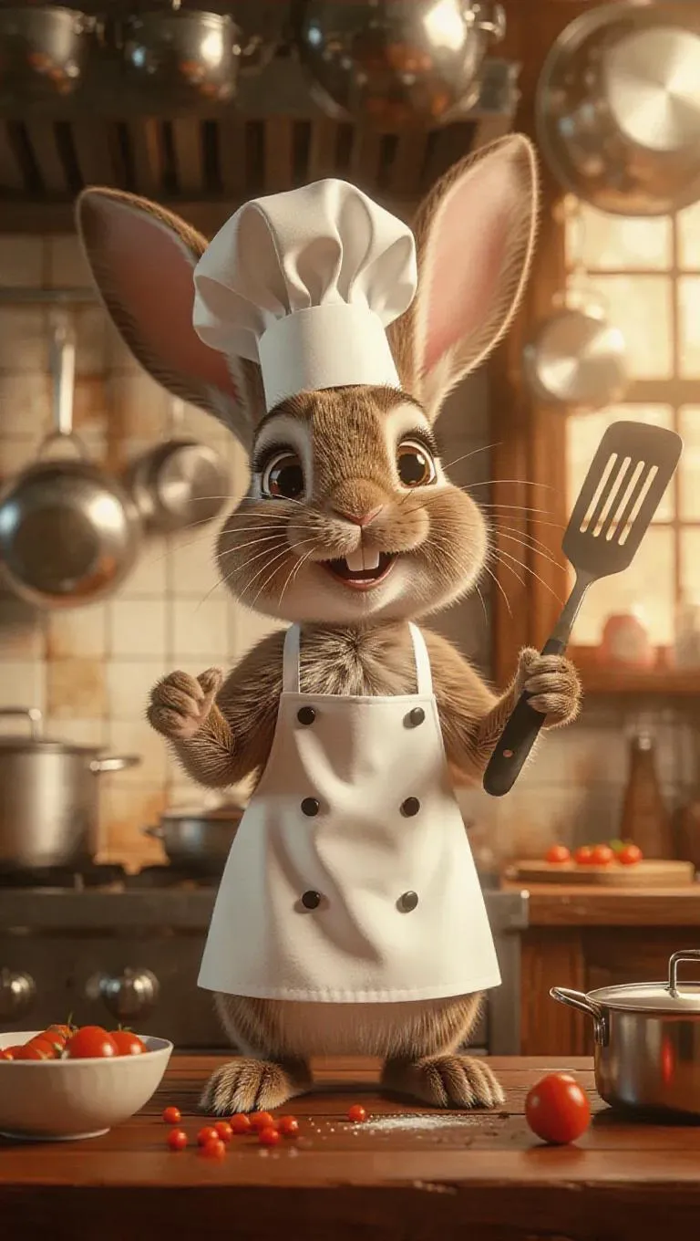 A 3D rabbit image wearing a chef's hat and apron, standing upright on two legs like a human, holding a spatula, surrounded by cooking ingredients and a bustling kitchen, exuding a cheerful and creative atmosphere, with pots and pans hanging in the background, adding a sense of warmth.
