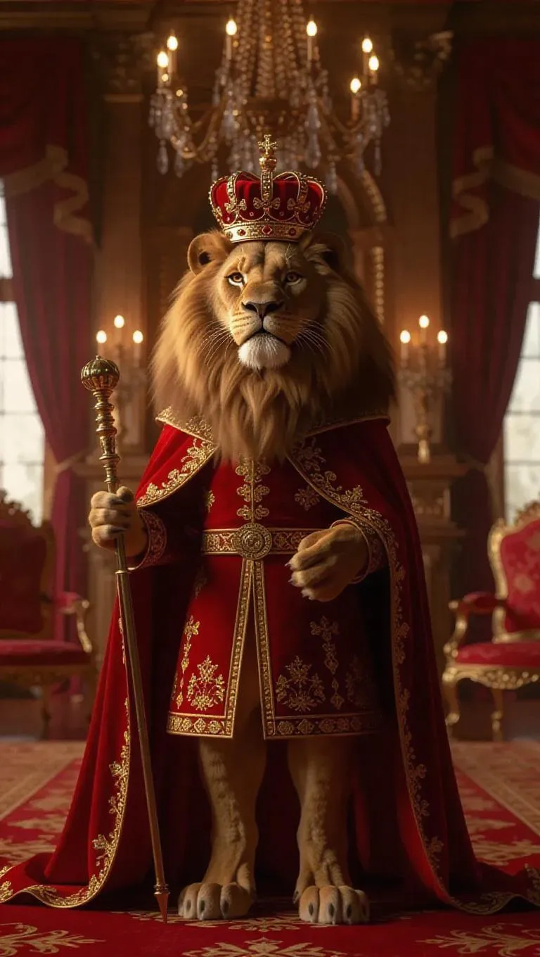 A 3D lion image wearing a crown and robe, standing upright on two legs like a human, holding a scepter, surrounded by a royal palace and luxurious artifacts, exuding a regal and majestic atmosphere, with chandeliers and velvet curtains in the background, adding a sense of grandeur.