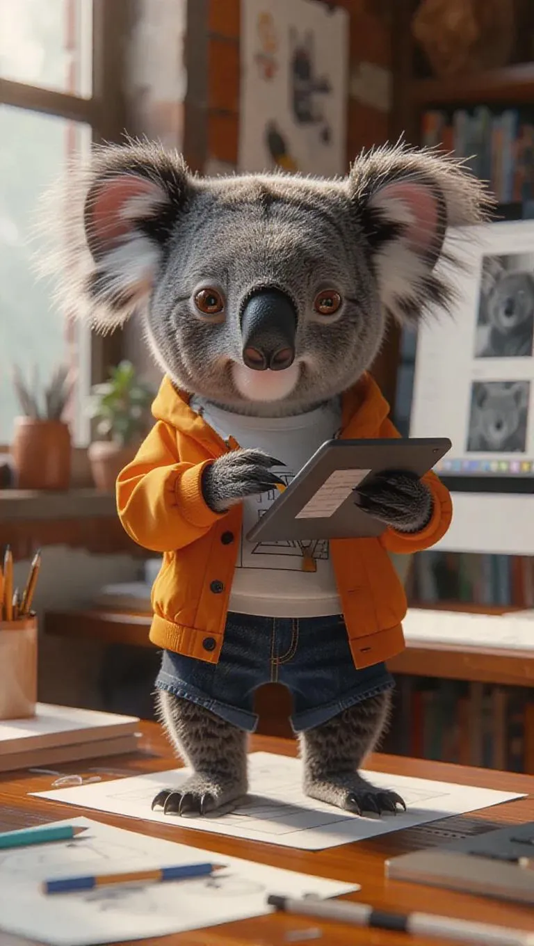 A 3D koala image wearing a graphic designer's casual outfit, standing upright on two legs like a human, holding a stylus and working on a tablet, surrounded by a creative workspace with sketches and a computer monitor, exuding an artistic and innovative atmosphere.