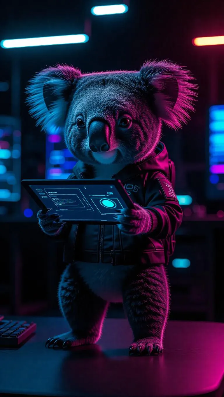 A 3D koala image wearing a graphic designer's futuristic outfit, standing upright on two legs like a human, holding a touchscreen device and interacting with a holographic display, surrounded by a modern workspace with LED lights and tech gadgets, exuding a high-tech and innovative atmosphere.