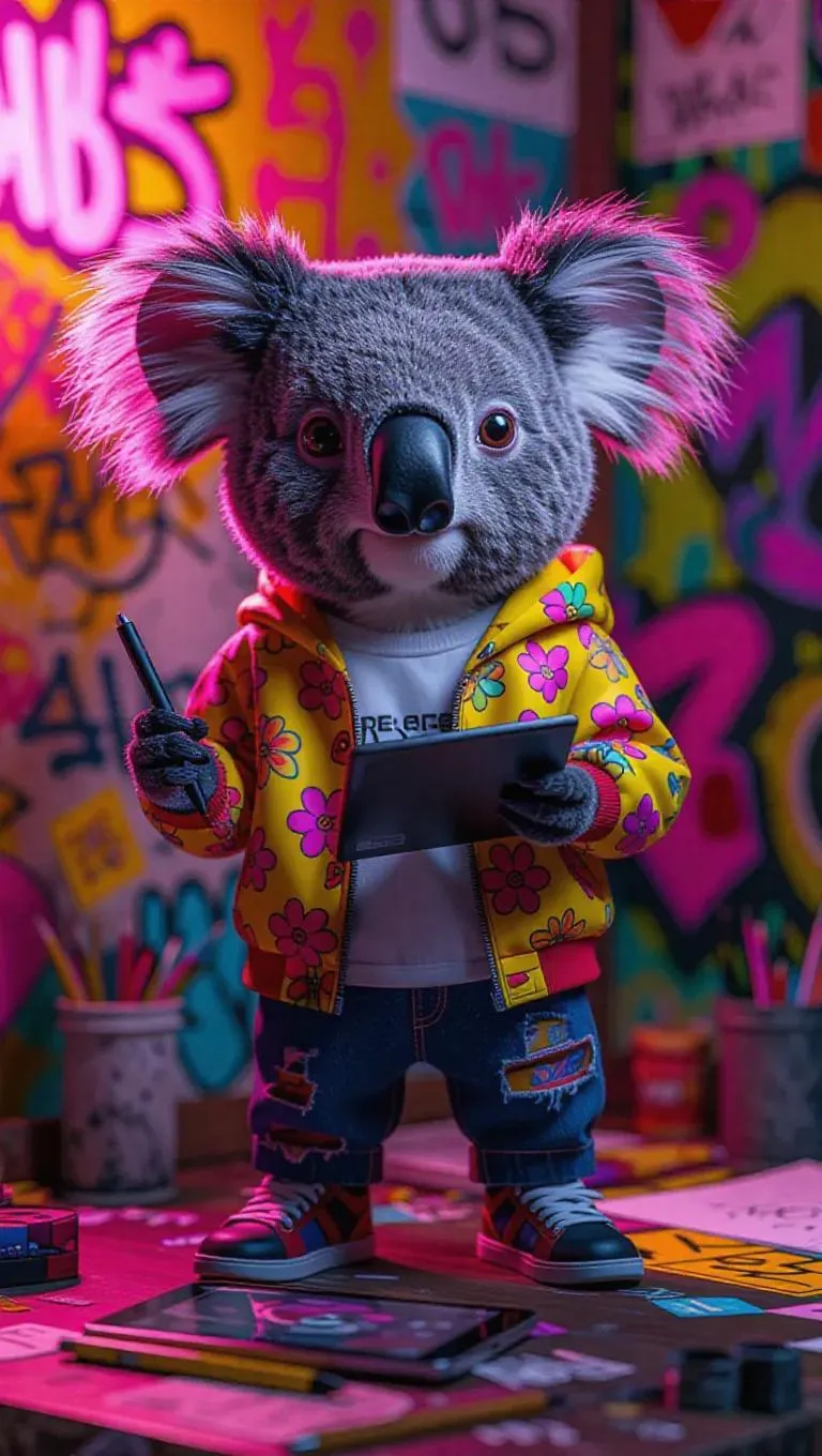 A 3D koala image wearing a graphic designer's streetwear outfit, standing upright on two legs like a human, holding a digital pen and sketching on a tablet, surrounded by a vibrant studio with graffiti and art supplies, exuding a lively and urban atmosphere.