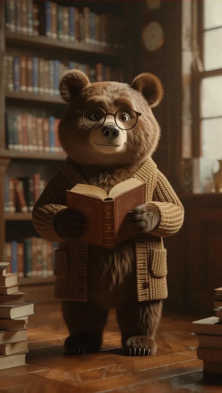 A 3D bear image wearing a librarian's cardigan and glasses, standing upright on two legs like a human, holding a stack of books and organizing shelves, surrounded by a quiet library with reading nooks, exuding a calm and studious atmosphere.