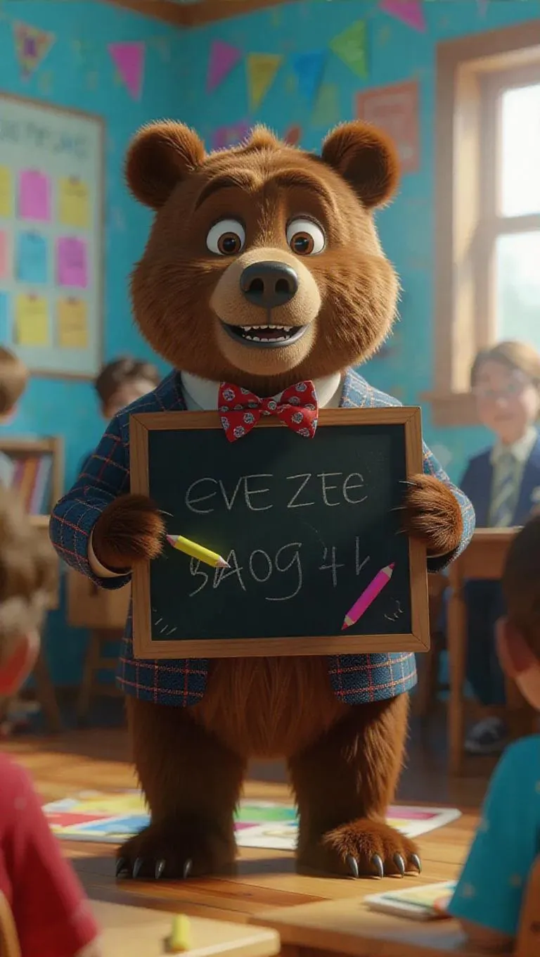 A 3D bear image wearing a teacher's blazer and a bow tie, standing upright on two legs like a human, holding a chalkboard and teaching students, surrounded by a vibrant classroom with colorful posters, exuding a lively and educational atmosphere.