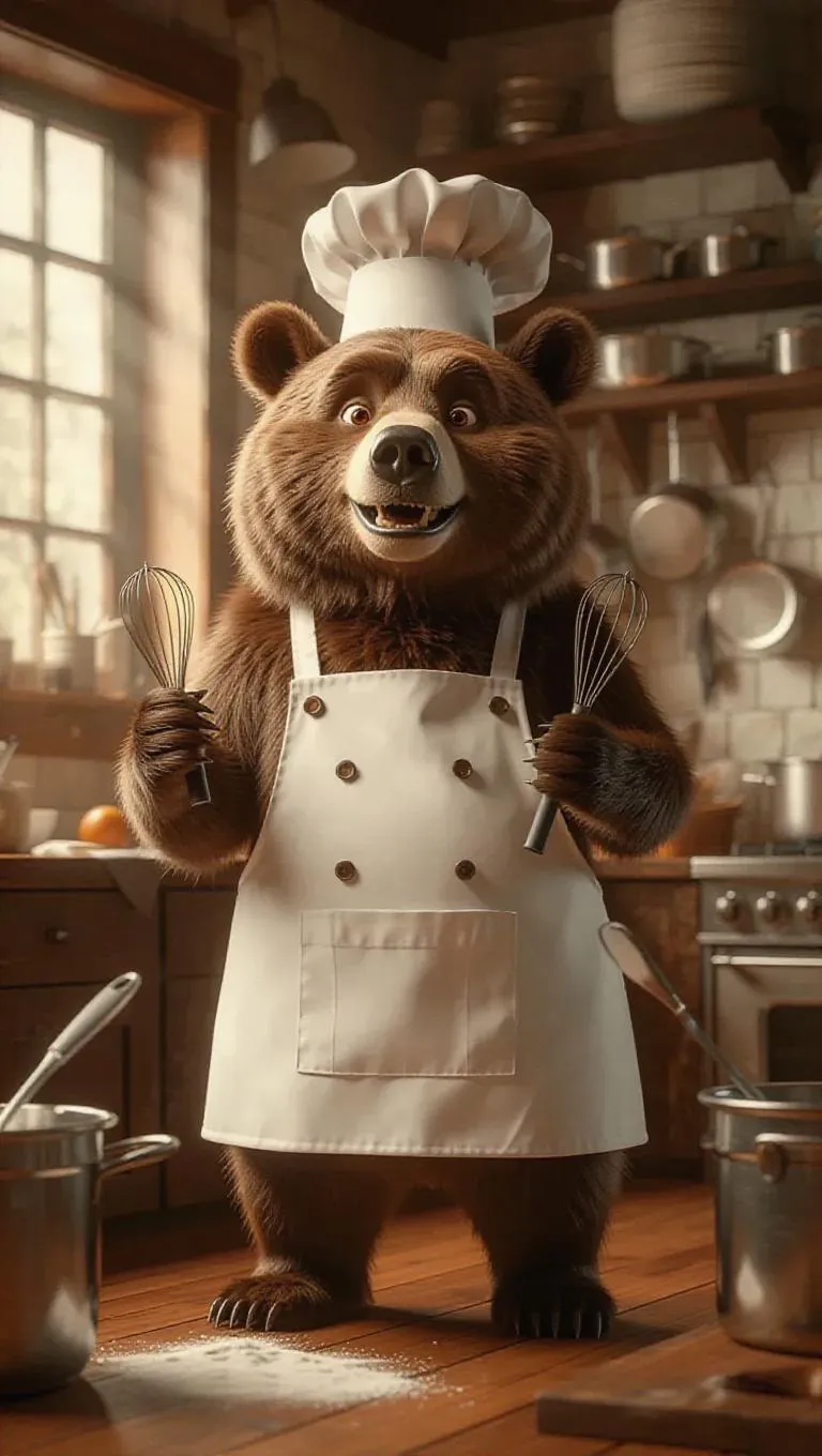 A 3D bear image wearing a chef's apron and a toque, standing upright on two legs like a human, holding a whisk and mixing ingredients, surrounded by a busy kitchen with pots and pans, exuding a warm and inviting atmosphere.