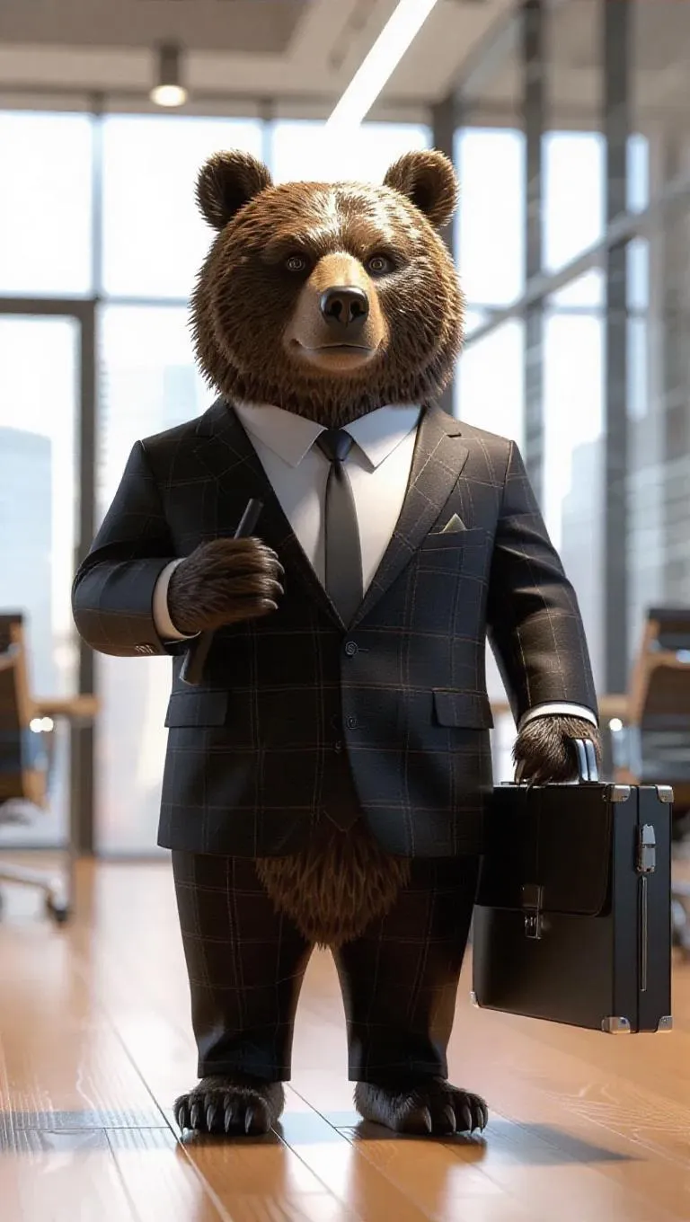 A 3D bear image wearing a business suit and tie, standing upright on two legs like a human, holding a briefcase and preparing for a meeting, surrounded by a modern office with glass walls, exuding a professional and corporate atmosphere.