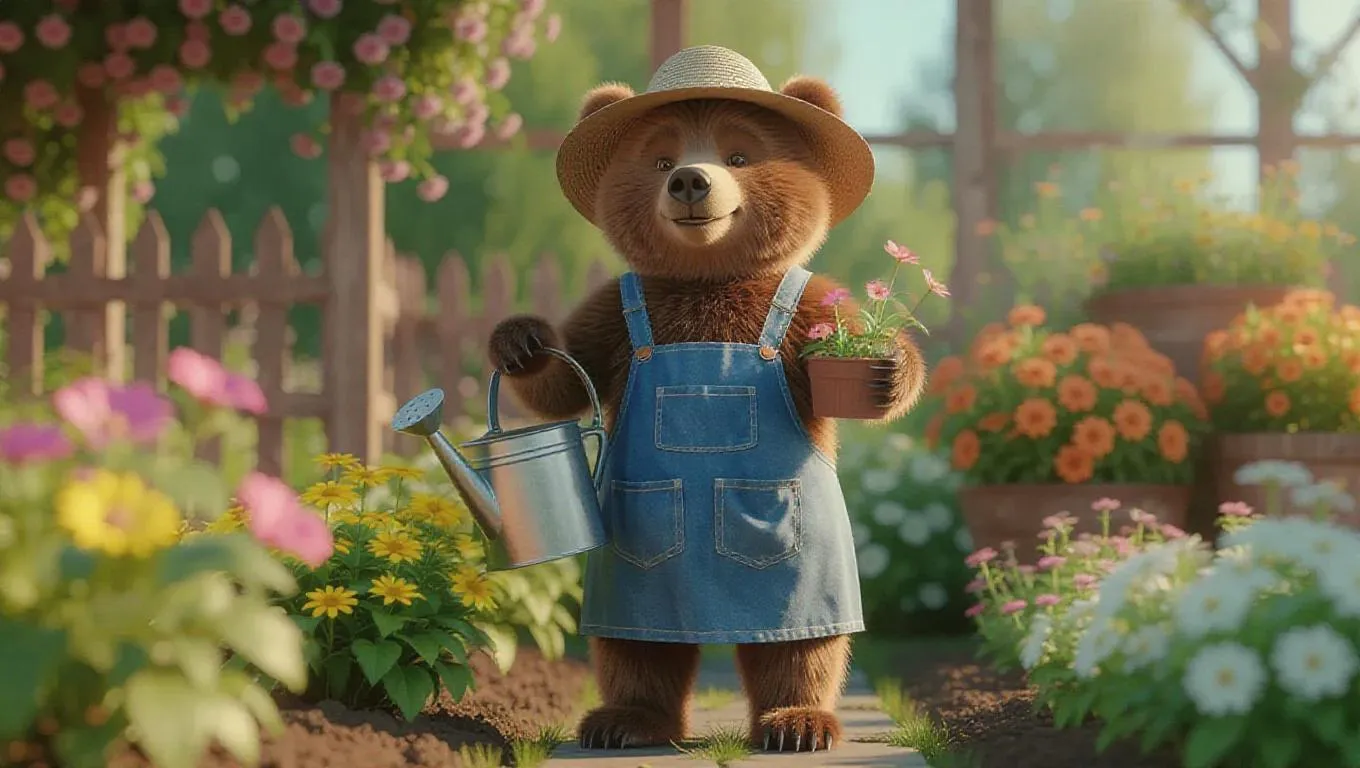 A 3D bear image wearing a gardener's apron and sun hat, standing upright on two legs like a human, holding a watering can and tending to plants, surrounded by a blooming garden with flowers, exuding a peaceful and serene atmosphere.