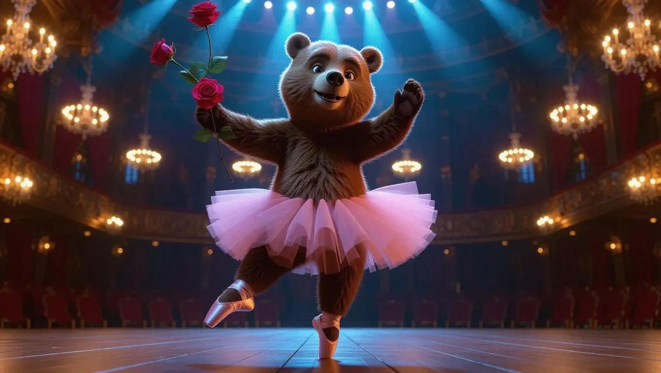 A 3D bear image wearing a ballerina's tutu and pointe shoes, standing upright on two legs like a human, holding a rose and performing a dance, surrounded by a grand theater with chandeliers, exuding a graceful and elegant atmosphere.
