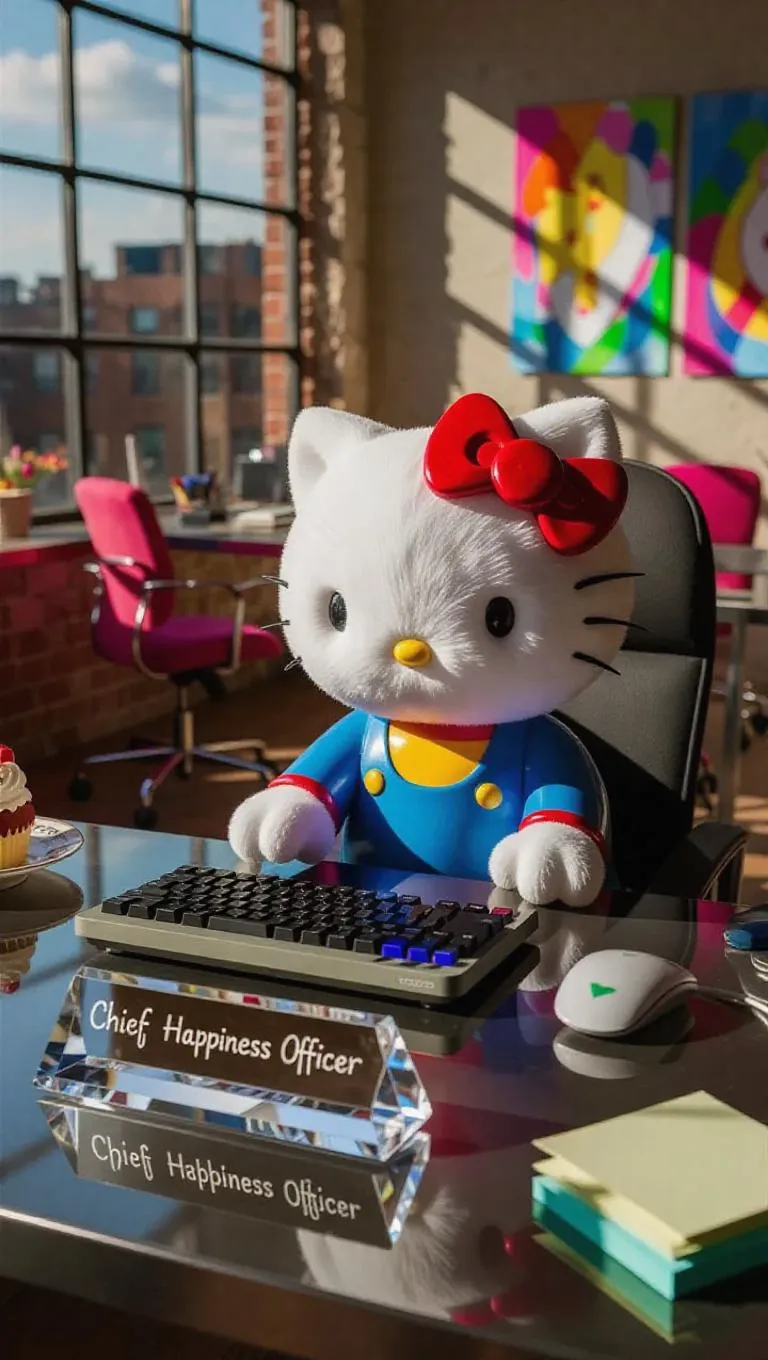 Ultra-realistic studio photography captures Hello Kitty at a sleek metal workstation, her ceramic-white fur showing individual synthetic strands under bright natural sunlight. One paw taps a gaming keyboard, the other holds a tablet with an animated chart. Blurred swivel chairs and colorful murals decorate the creative workspace. A crystal nameplate "Chief Happiness Officer" catches midday light from large glass windows. Macro details reveal a dessert plate and a stack of sticky notes, with her signature yellow bow softly out-of-focus.