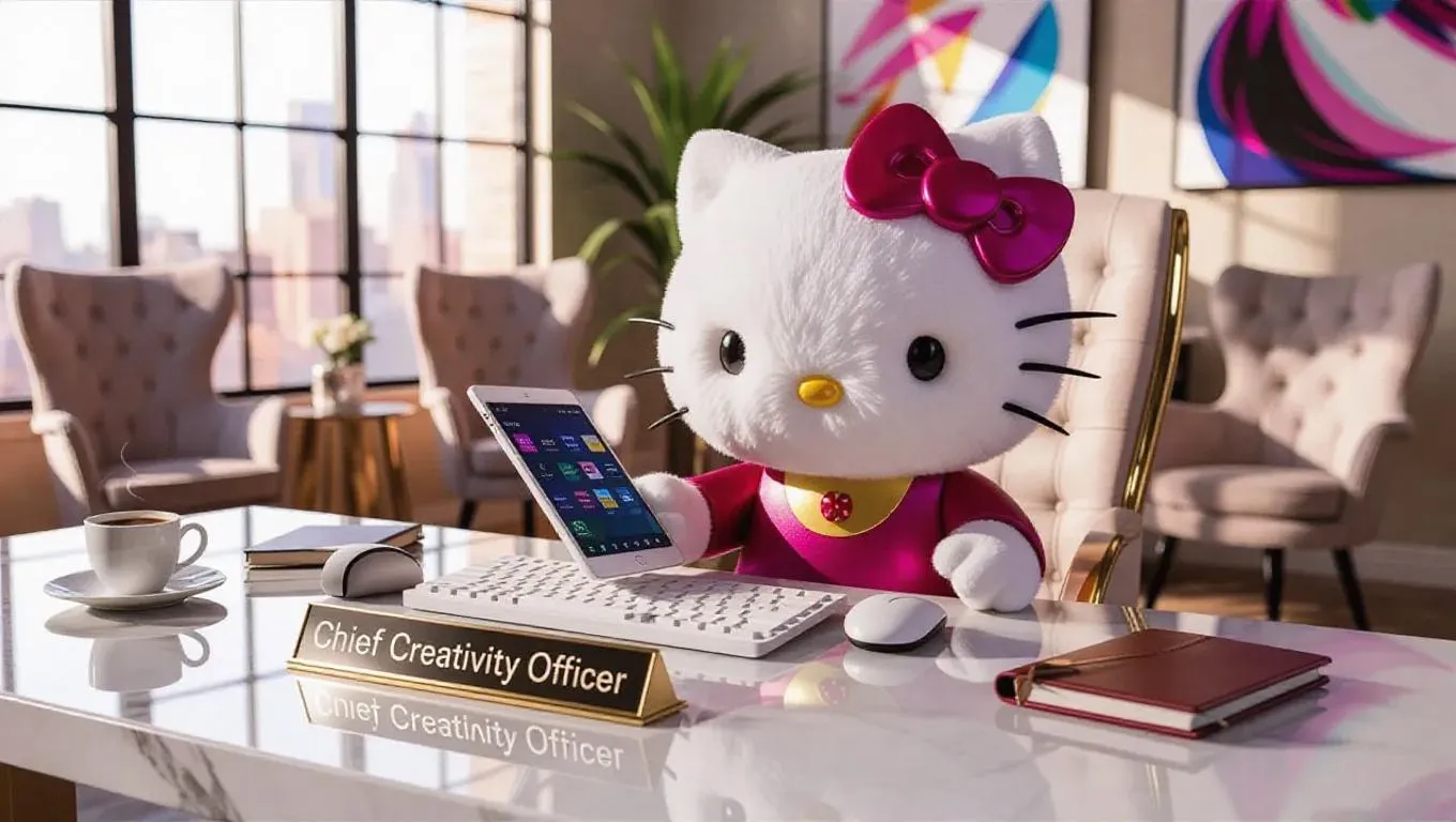 Ultra-realistic studio photography captures Hello Kitty at a stylish marble desk, her ceramic-white fur showing individual synthetic strands under clear overhead lighting. One paw taps a sleek mechanical keyboard, the other holds a tablet showcasing a vibrant dashboard. Blurred luxury chairs and abstract artwork decorate the posh workspace. A shiny nameplate "Chief Creativity Officer" catches morning light from wide windows. Macro details reveal a gourmet coffee and a few elegant notebooks, with her signature silk bow softly out-of-focus.