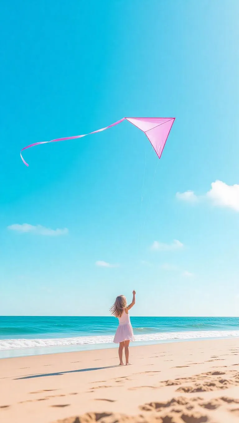 A delicate pink world where a little girl is playing with a pink kite on a sunny beach. The sky is a bright blue hue, and the kite is flying high above the golden sand. The scene feels light and joyful.