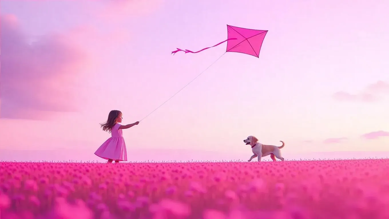 A delicate pink world where a little girl is playing with a pink kite while her puppy runs beside her. The sky is a soft lavender hue, and the kite is flying high above the field of pink flowers. The scene feels light and joyful.