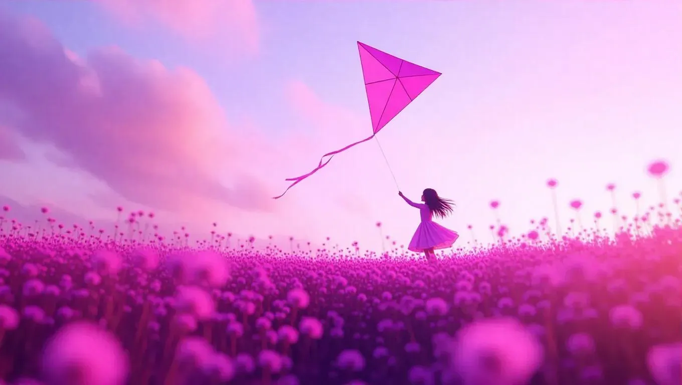 A delicate pink world where a little girl is dancing with a pink kite in a meadow. The sky is a soft lavender hue, and the kite is spinning beautifully above the field of pink flowers. The scene feels lively and joyful.