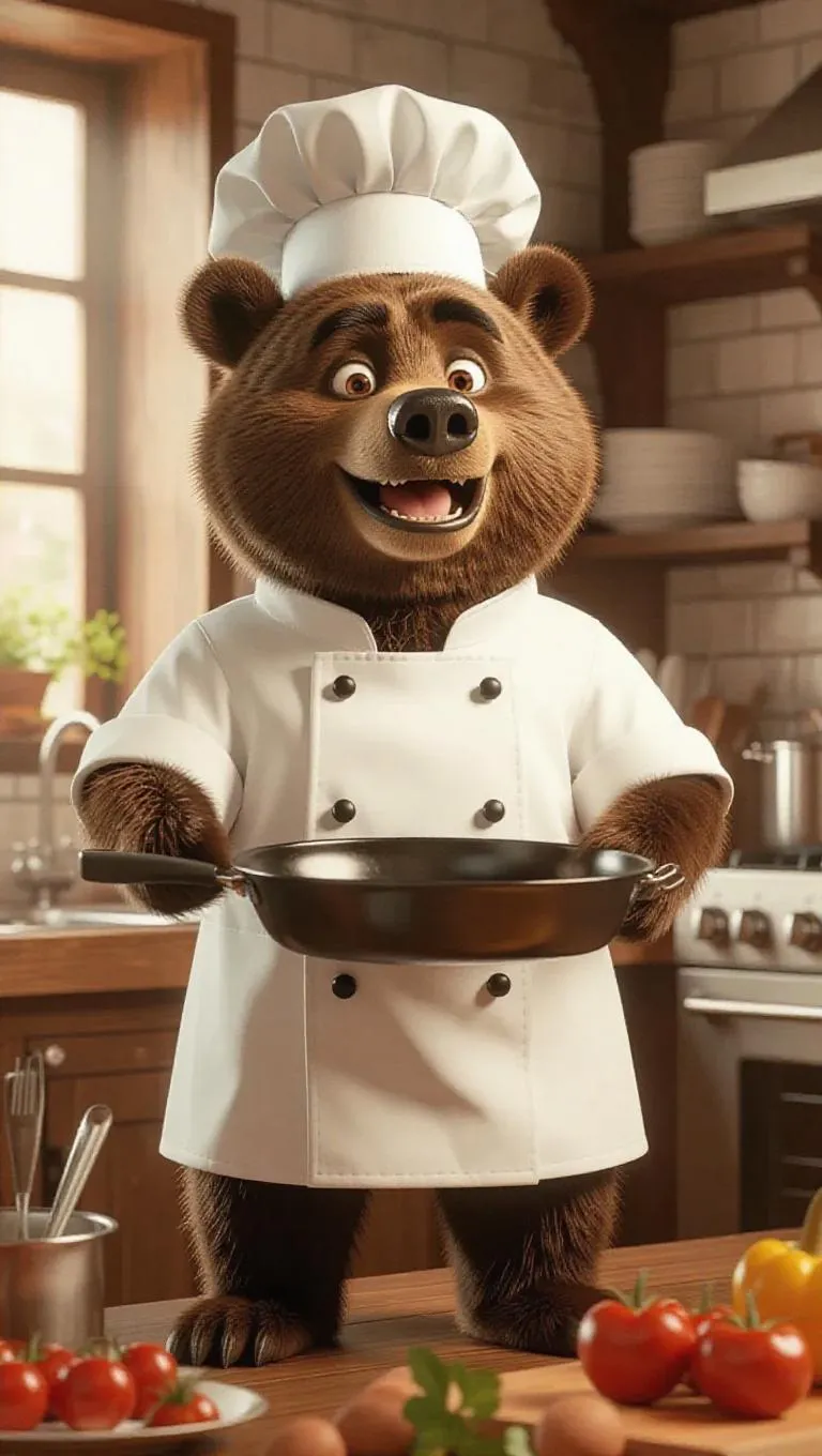 A 3D bear image wearing a chef's uniform, standing upright on two legs like a human, holding a frying pan, surrounded by a kitchen and delicious food in the background, exuding a brave and heroic atmosphere.