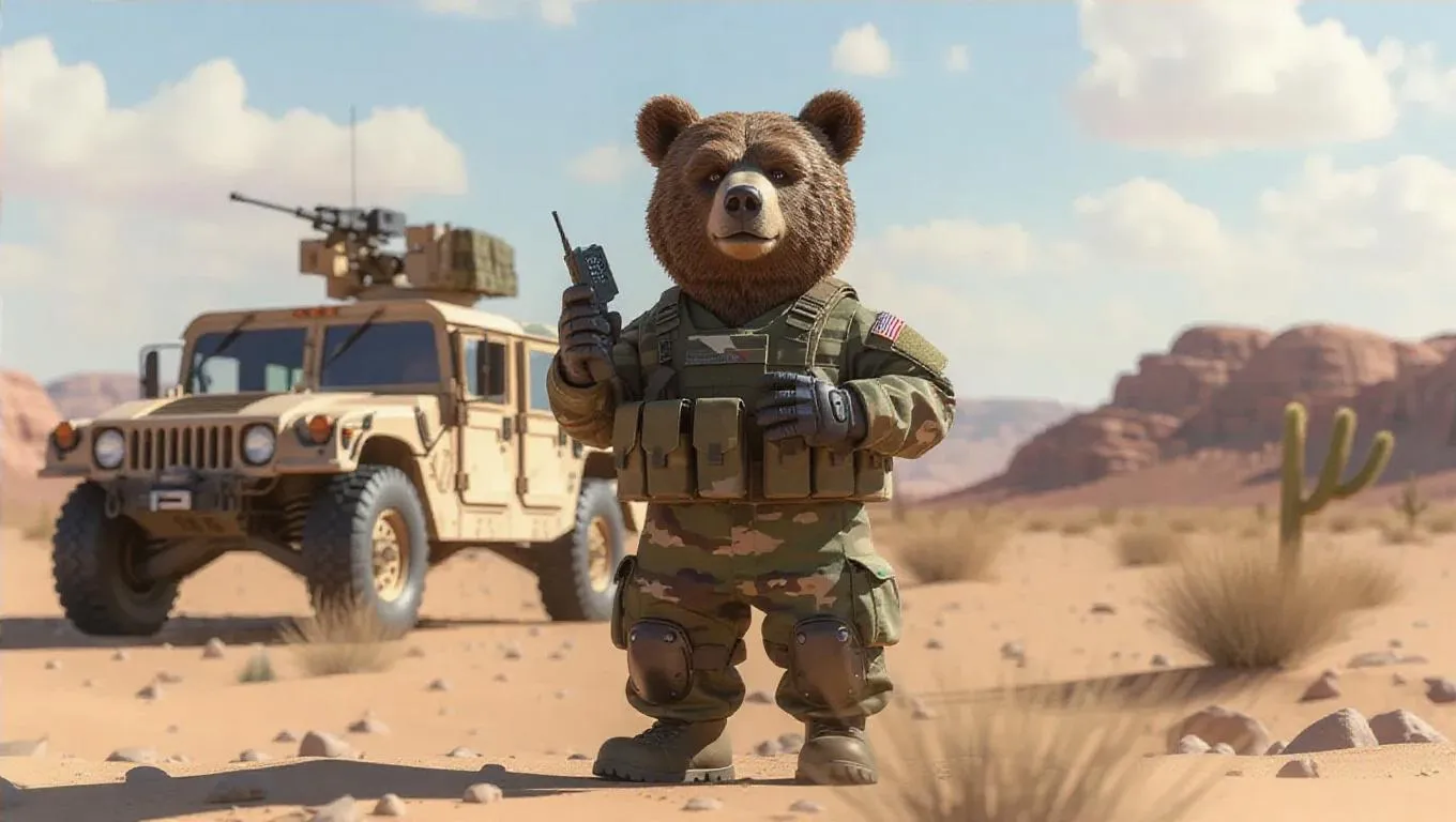 A 3D bear image wearing an army uniform, standing upright on two legs like a human, holding a walkie-talkie, surrounded by a military vehicle and a desert landscape in the background, exuding a brave and heroic atmosphere.