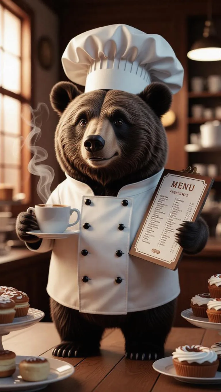 A 3D bear image wearing a chef's coat and hat, standing upright on two legs like a human, holding a steaming coffee cup and a menu board, surrounded by a cozy café with pastries on display, exuding a warm and welcoming atmosphere.