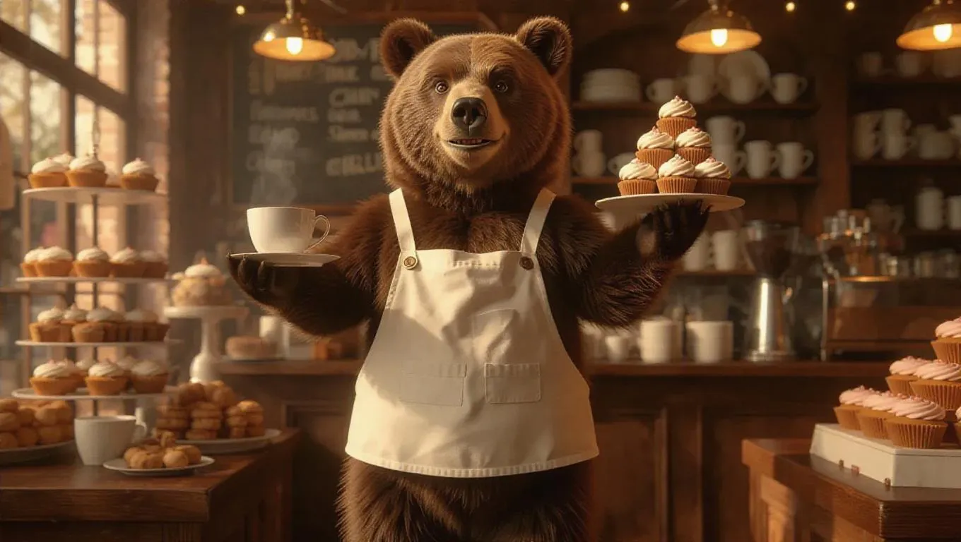 A 3D bear image wearing a barista's apron and suspenders, standing upright on two legs like a human, holding a steaming coffee cup and a cupcake tower, surrounded by a bustling café with pastries on display, exuding a lively and welcoming atmosphere.