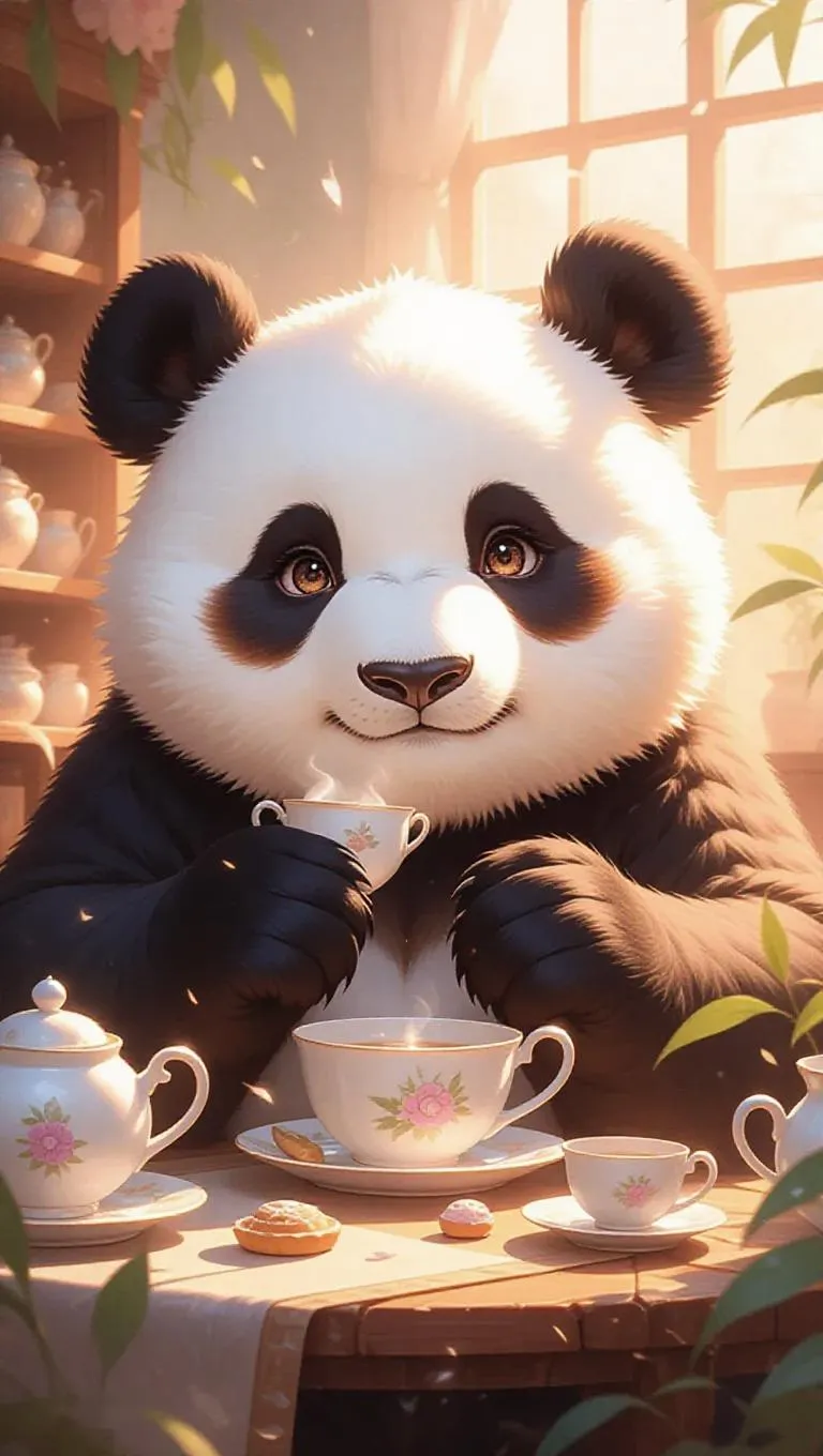 A fluffy, oversized panda with sparkling eyes and a shy smile, surrounded by a cloud of shimmering fluff, creating a tranquil, whimsical atmosphere. The scene is set in a serene, oversized tea shop with delicate treats and fluffy, oversized teacups. The style is reminiscent of an Asian watercolor painting, with a graceful and soothing feel.