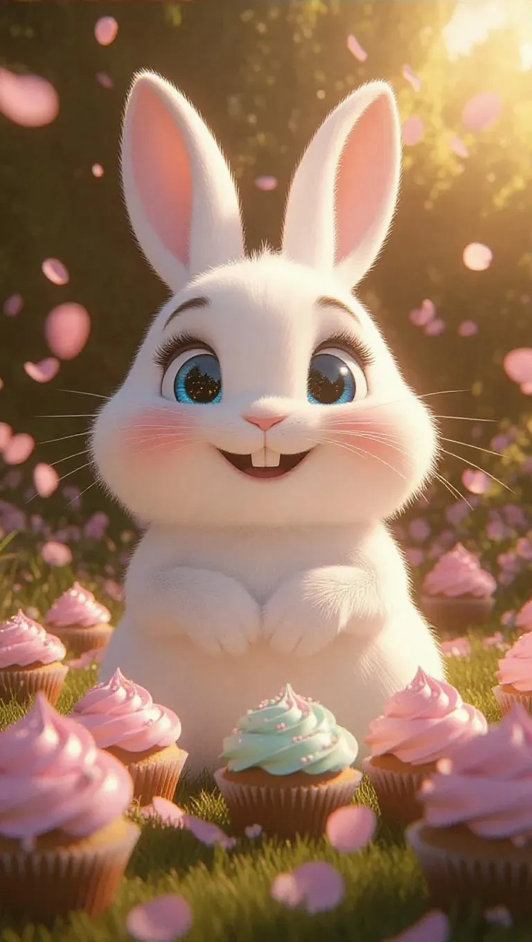 A bright, oversized rabbit with sparkling eyes and a cheerful grin, surrounded by a cloud of fluffy, pastel-colored fluff, creating a joyful, whimsical atmosphere. The scene is set in a sunny, oversized flower garden with petal-like treats and fluffy, oversized cupcakes. The style is reminiscent of a children’s storybook, with a vibrant and playful feel.