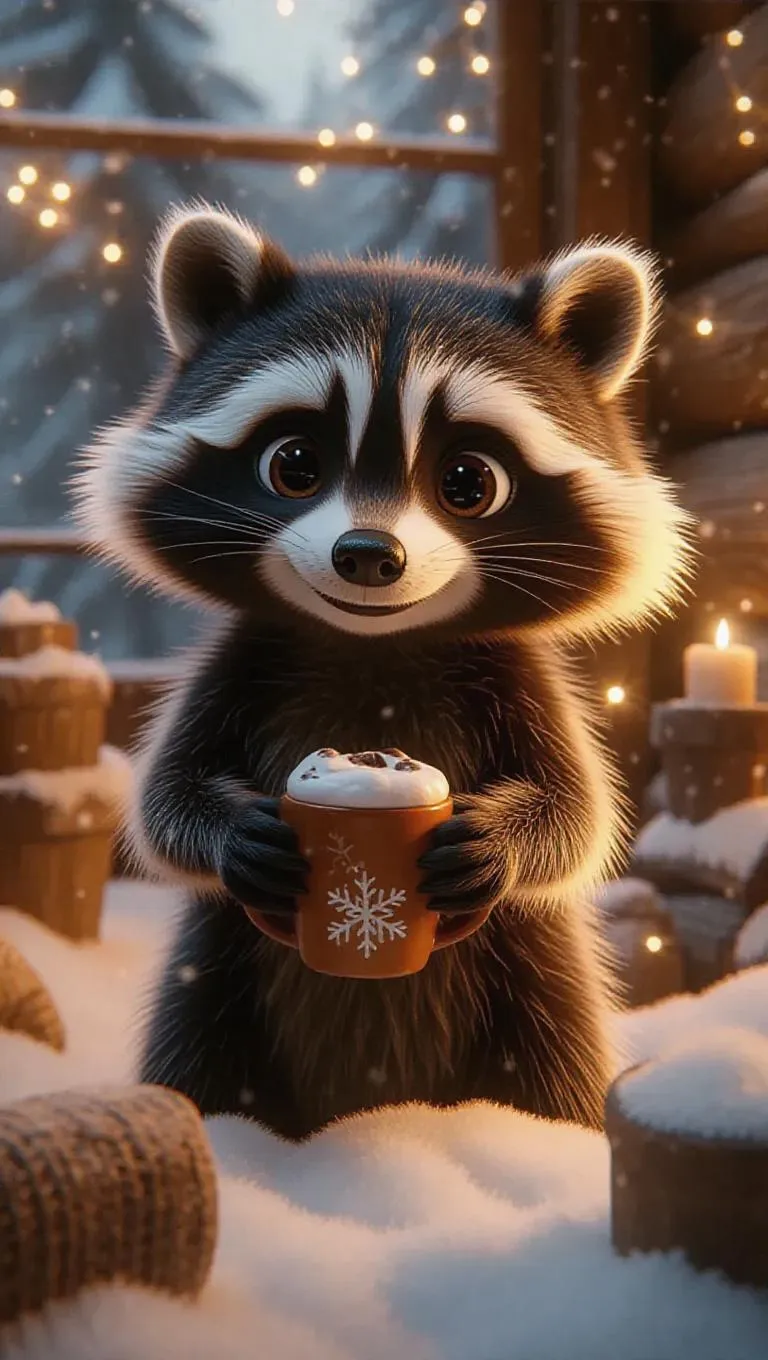 A soft, oversized raccoon with sparkling eyes and a friendly smile, surrounded by a cloud of fluffy, snow-like fluff, creating a festive, whimsical atmosphere. The scene is set in a cozy, oversized winter cabin with hot cocoa treats and fluffy, oversized blankets. The style is reminiscent of a holiday postcard, with a warm and inviting feel.