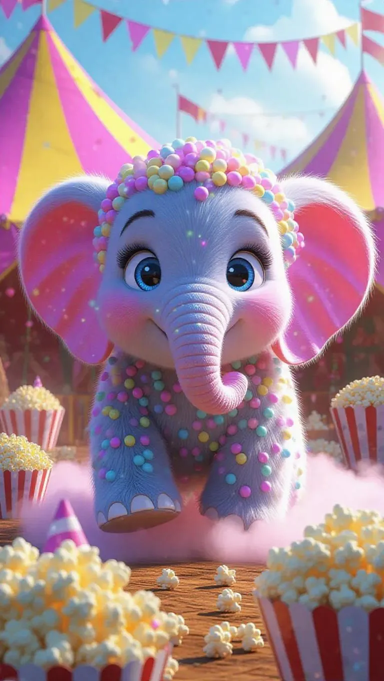 A fluffy, oversized elephant with sparkling eyes and a playful smile, surrounded by a cloud of colorful fluff, creating a lively, whimsical atmosphere. The scene is set in a vibrant, oversized circus with candy-colored tents and fluffy, oversized popcorn. The style is reminiscent of a carnival flyer, with a fun and exciting feel.