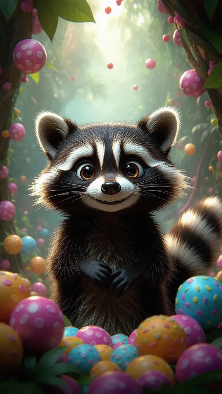 A cheerful, oversized raccoon with sparkling eyes and an adventurous grin, surrounded by a cloud of bright, playful fluff, creating a daring, whimsical atmosphere. The scene is set in a fantastical, oversized jungle with candy-colored treats and fluffy, oversized trees. The style is reminiscent of an adventurous storybook cover, with an exploratory and exciting feel.