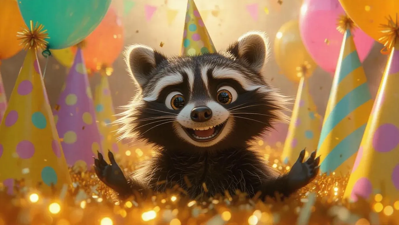 A soft, oversized raccoon with sparkling eyes and a bright smile, surrounded by a cloud of golden fluff, creating a festive, whimsical atmosphere. The scene is set in a joyful, oversized celebration with fluffy, oversized party hats and colorful balloons. The style is reminiscent of a festive party invitation, with a cheerful and celebratory feel.