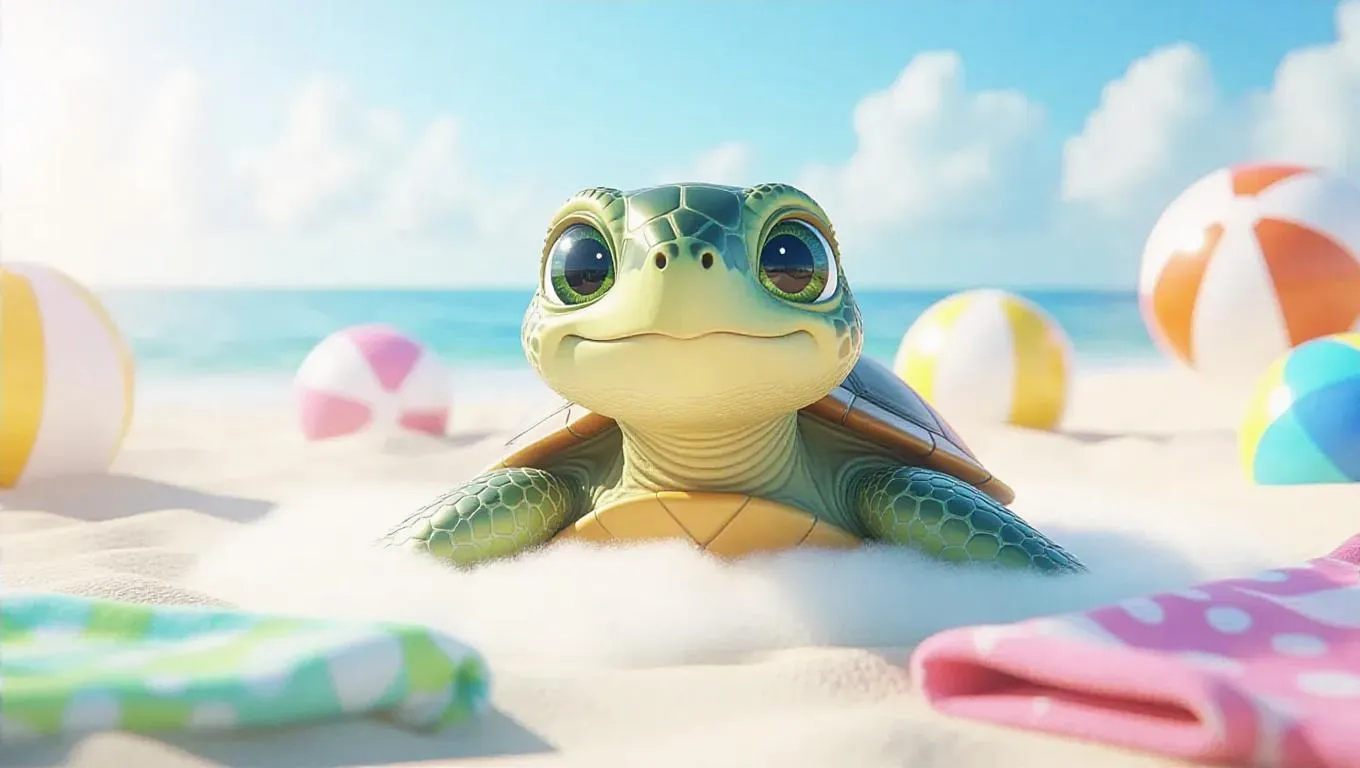 A gentle, oversized turtle with sparkling eyes and a serene smile, surrounded by a cloud of soft, sandy fluff, creating a calm, whimsical atmosphere. The scene is set on a beautiful, oversized beach with fluffy, oversized beach balls and soft, colorful towels. The style is reminiscent of a summer postcard, with a relaxing and sunny feel.