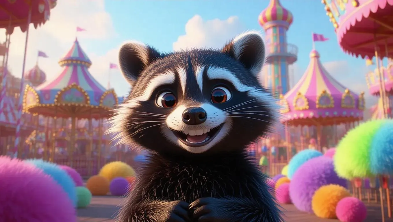 A cheerful, oversized raccoon with sparkling eyes and a joyful grin, surrounded by a cloud of vibrant, rainbow-like fluff, creating a delightful, whimsical atmosphere. The scene is set in an oversized amusement park with fluffy, oversized rides and candy kiosks. The style is reminiscent of a whimsical carnival poster, with a colorful and exciting feel.