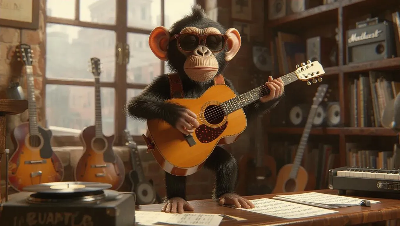 A 3D monkey image wearing a musician's outfit and sunglasses, standing upright on two legs like a human, holding a guitar and analyzing song sheets on a music stand, surrounded by a desk cluttered with instruments and records, exuding a lively and rhythmic atmosphere.