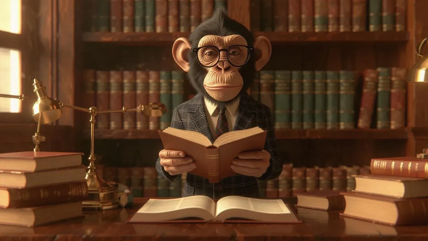 A 3D monkey image wearing a librarian outfit and glasses, standing upright on two legs like a human, holding a book and analyzing notes on a desk, surrounded by a desk cluttered with books and bookmarks, exuding a scholarly and peaceful atmosphere.