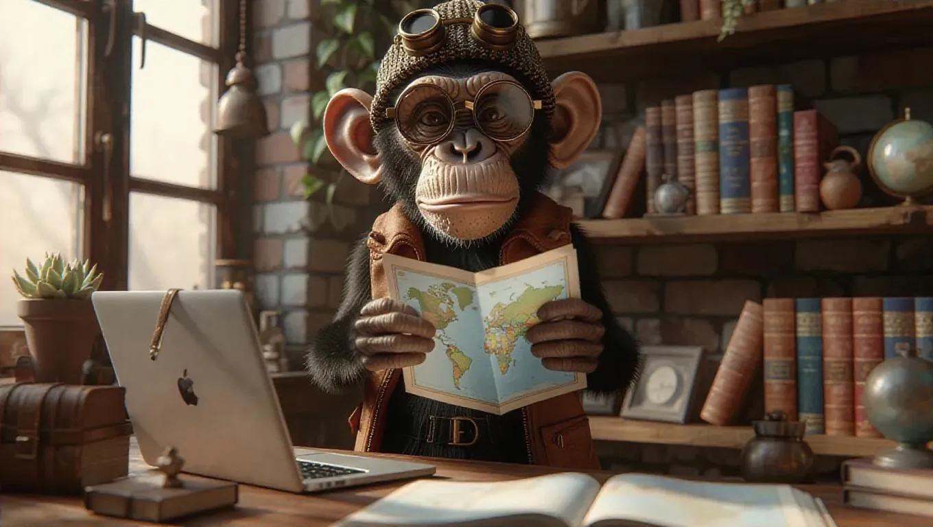 A 3D monkey image wearing a traveler's outfit and binoculars, standing upright on two legs like a human, holding a map and analyzing travel routes on a laptop, surrounded by a desk cluttered with souvenirs and guides, exuding a wanderlust and explorative atmosphere.