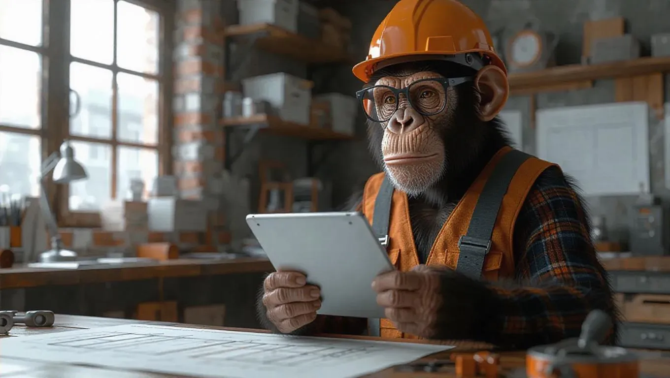 A 3D monkey image wearing an engineer's hard hat and safety glasses, standing upright on two legs like a human, holding a wrench and analyzing schematics on a tablet, surrounded by a desk cluttered with blueprints and tools, exuding a technical and systematic atmosphere.