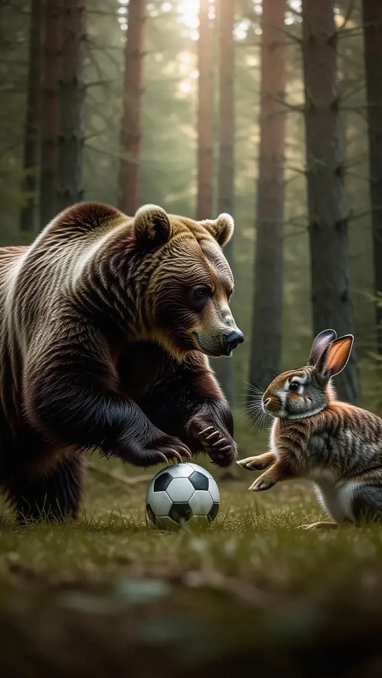 In a quiet forest glade, a bear and a rabbit are engaged in a fierce game of soccer. The bear dribbles the ball with precision, its fur glistening with dew, while the rabbit uses its incredible speed to intercept and make swift passes. The trees around them sway as the two animals compete fiercely, their determination evident in every move.