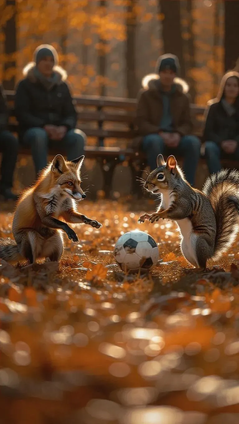 In a vibrant urban park, a fox and a squirrel are engaged in a fierce game of soccer. The fox dribbles the ball with flair, its coat shining in the sunlight, while the squirrel uses its quick reflexes to intercept and make agile passes. The nearby bench is filled with spectators as the two animals compete fiercely, their determination evident in every move.