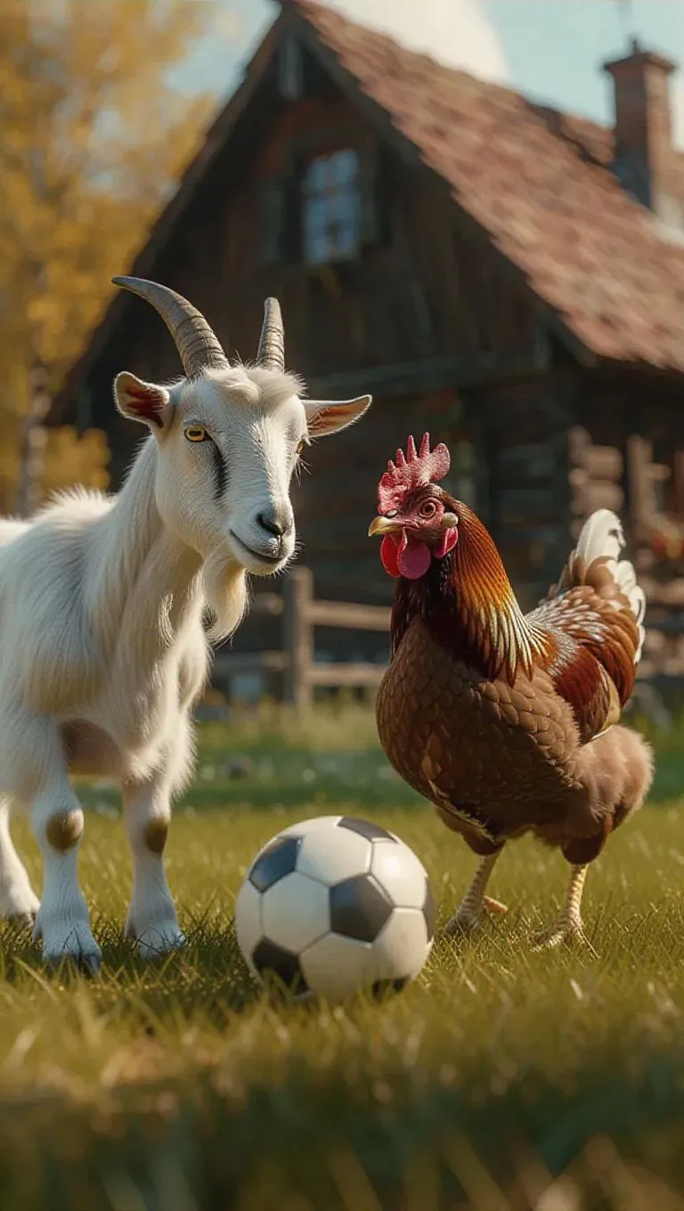 In a charming little village, a goat and a chicken are engaged in a fierce game of soccer. The goat dribbles the ball with cheekiness, its beard fluttering in the breeze, while the chicken uses its quick flaps to intercept and make pecking passes. The quaint homes around them echo with cheers as the two animals compete fiercely, their determination evident in every move.