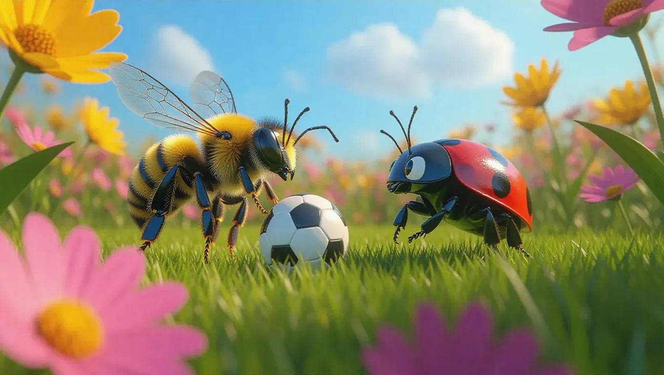 In a vibrant flower field, a bee and a ladybug are engaged in a fierce game of soccer. The bee buzzes energetically with the ball, its wings shimmering in the sunlight, while the ladybug scuttles quickly to intercept and make clever passes. The flowers bloom wildly around them as the two animals compete fiercely, their determination evident in every move.
