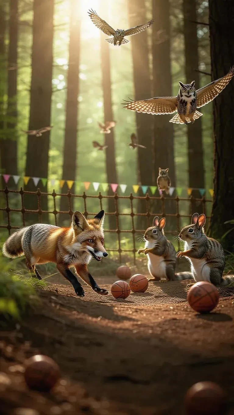 In a serene forest glade, a variety of animals are engaged in different sports competitions. A fox sprints on a natural dirt path, its fur glistening in the sunlight, while a rabbit hops over low fences with remarkable skill. An owl glides silently above the glade, preparing to swoop in a flying race. Nearby, a group of squirrels are playing an exciting game of basketball on a wooden court, and a snail is slowly but steadily making its way through a race course around the trees.