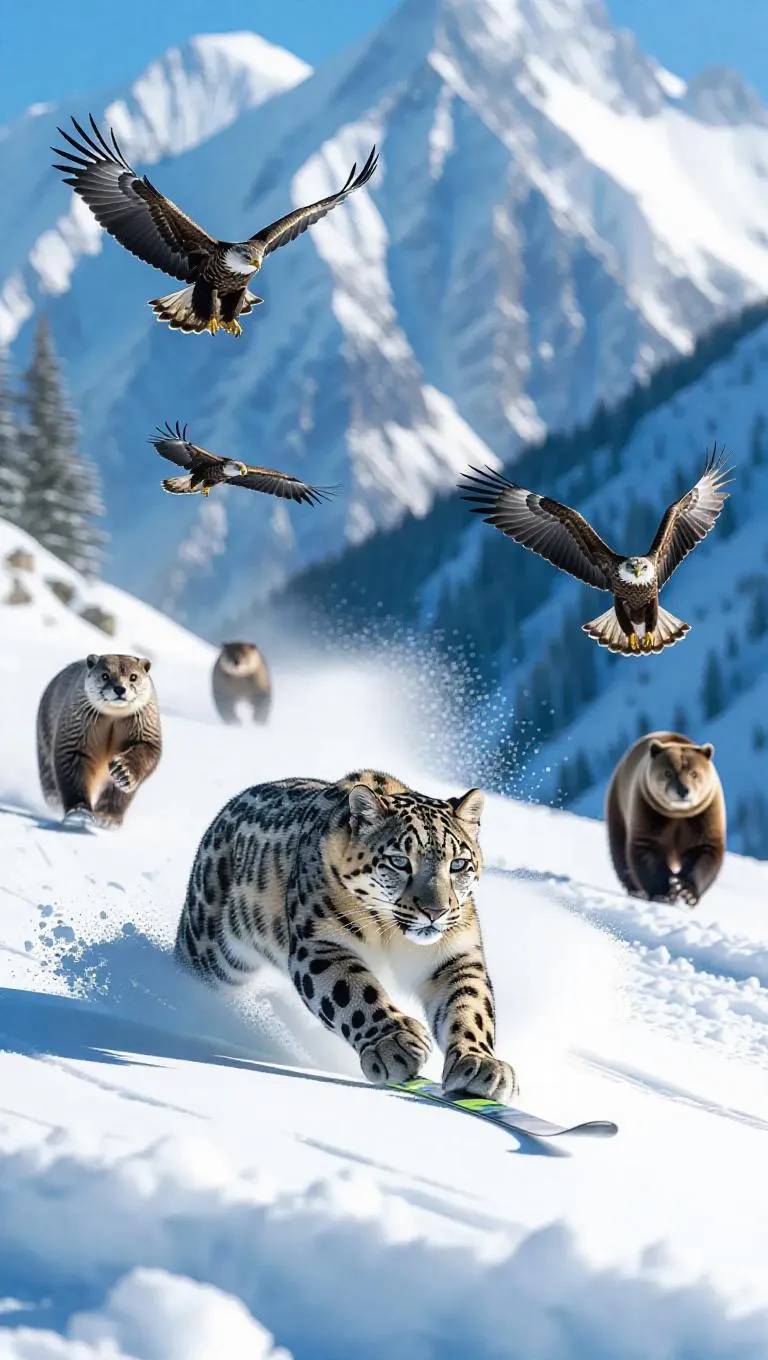 In a snowy mountain range, a variety of animals are engaged in different sports competitions. A snow leopard dashes down a slalom course, its coat blending with the snow, while a rabbit hops over snow mounds with impressive speed. An eagle soars above the mountain peaks, preparing for a winter flying competition. Nearby, a group of otters are having a fun game of ice hockey on a frozen pond, and a slow-moving bear is trekking through a snowy marathon path.