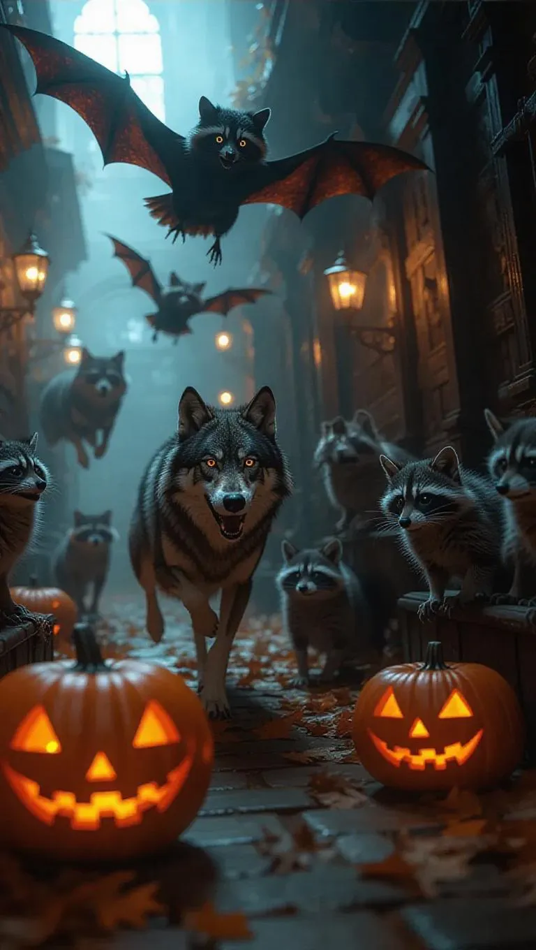 In a spooky haunted house, a variety of animals are engaged in different sports competitions. A ghostly wolf races through a foggy hallway, its eyes glowing ominously, while a bat flutters over eerie obstacles with grace. A pumpkin-headed crow soars above, preparing for a supernatural flying race. Nearby, a group of mischievous raccoons are playing a thrilling game of hide-and-seek, and a slow-moving ghost snail is navigating through a haunted marathon route.