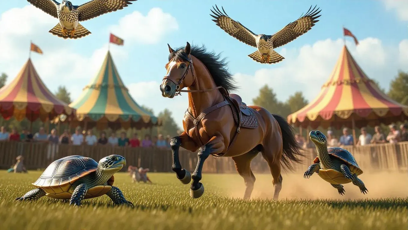 In a Renaissance festival setting, a variety of animals are engaged in different sports competitions. A wild stallion gallops across a grassy field, its mane flowing freely, while a hare hops over jester hats with great agility. A falcon swoops down from the sky, getting ready for a medieval flying contest. Nearby, a group of ferrets are playing a bright game of jousting, and a turtle is navigating through a quaint marathon path lined with cheering onlookers.