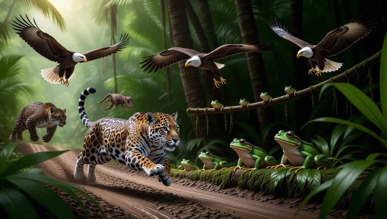 In a lush jungle environment, a variety of animals are engaged in different sports competitions. A jaguar sprints across a muddy path, its spots contrasting with the greenery, while a monkey swings effortlessly from branch to branch. An eagle soars above the treetops, preparing for a tropical flying event. Nearby, a group of frogs are engaged in a lively game of leapfrog, and a slow-moving sloth is making its way through a dense marathon jungle route.