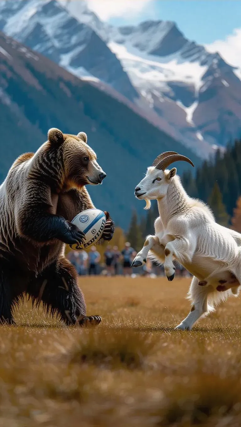 In a serene mountain sports arena, a bear and a mountain goat are engaged in a friendly game of rugby. The bear's strength and power allow it to make powerful tackles and carries, while the mountain goat's agility and speed help it to evade and make quick passes. The breathtaking mountain backdrop enhances the intensity of the game between the bear and mountain goat.
